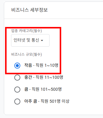 5. 비즈니스 세부정보 : 업종 카테고리 및 비즈니스 규모 선택 후 다음(선택내용 크게 상관없음)